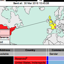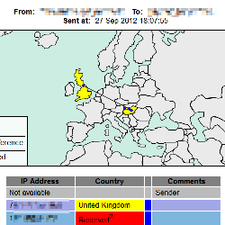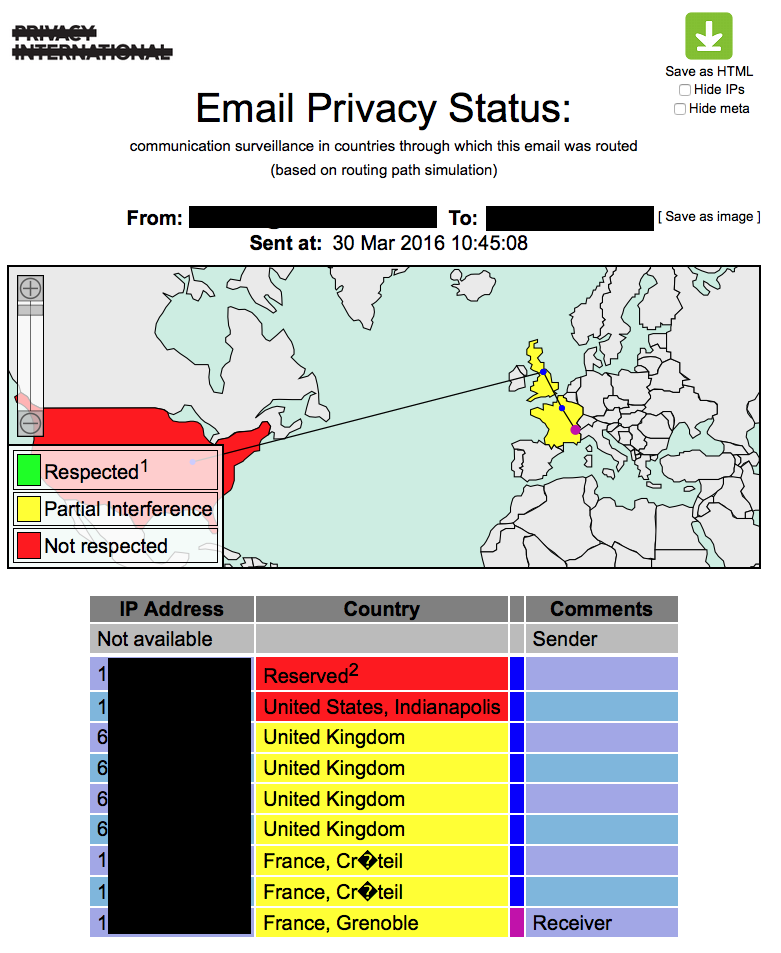 Furthermore, it generates a list of countries the email traveled across and use color codes to indicate whether or not it is likely that the email was intercepted or monitored.